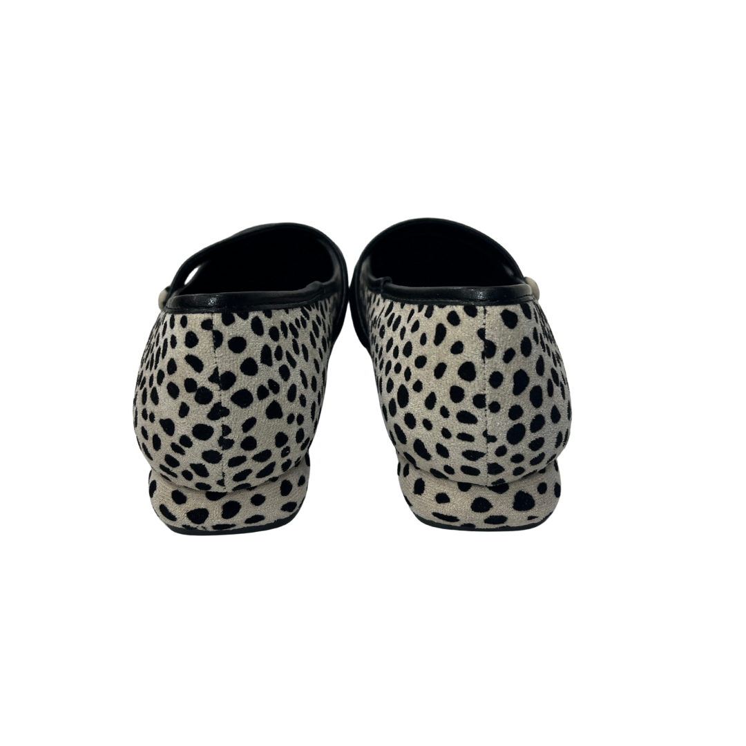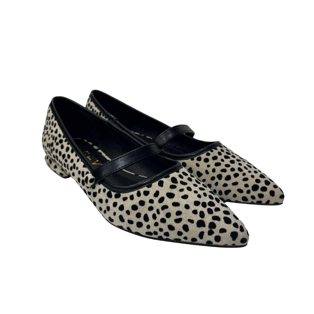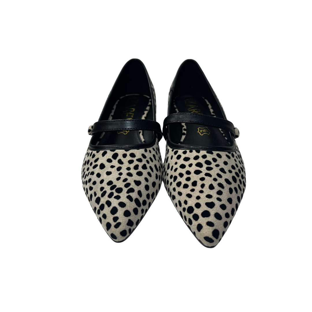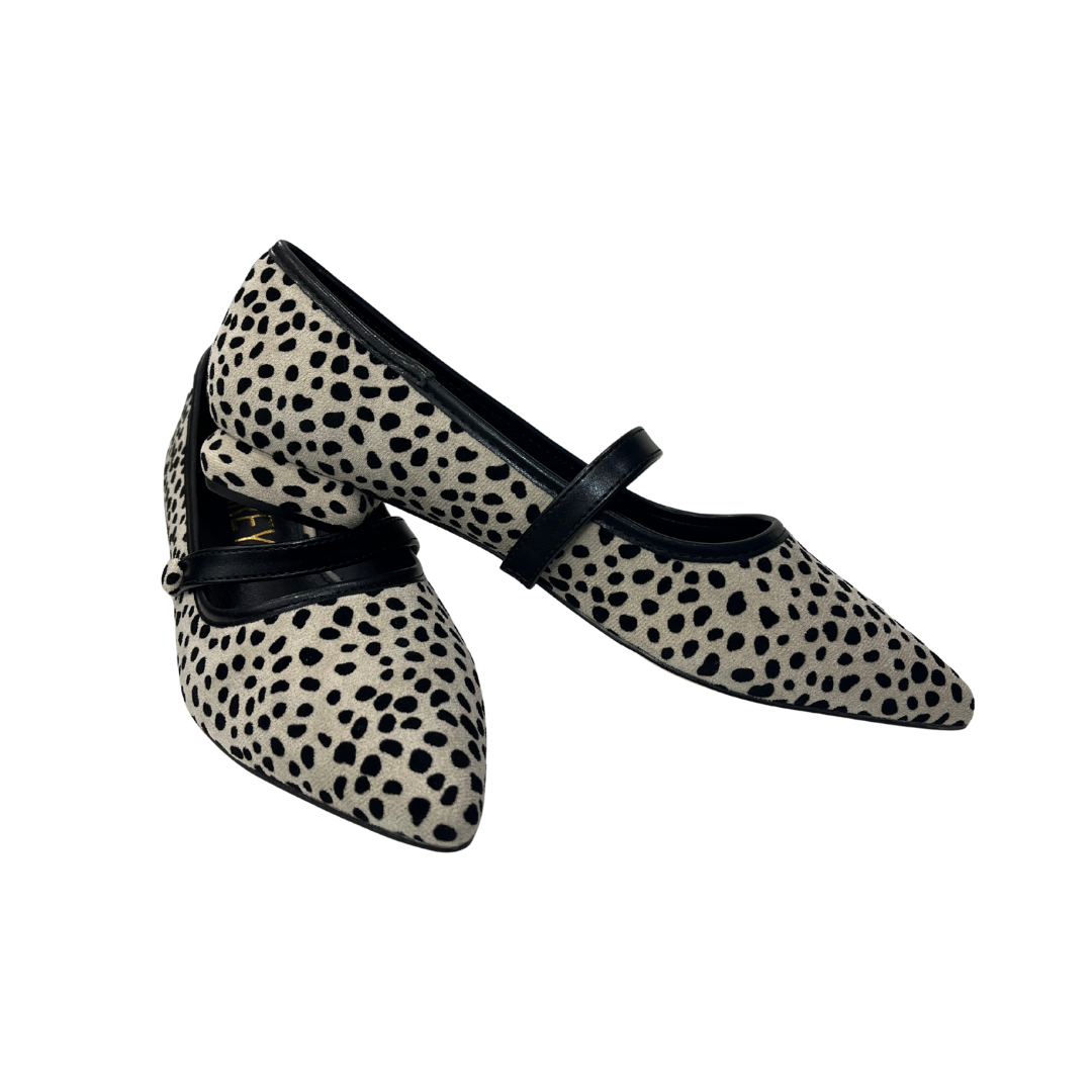 Una bailarina que combina dulzura y carácter sin esfuerzo. El estampado animal sobre fondo beige aporta esa energía salvaje que transforma un look básico en algo especial, mientras que la tira fina negra añade un toque sutil y femenino. El detalle más inesperado está en el tacón bajo con forma geométrica, tan cómodo como único.
