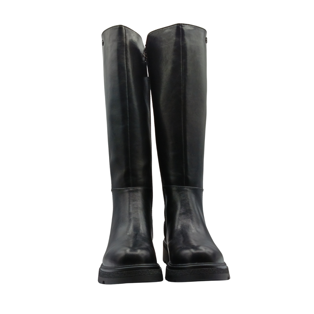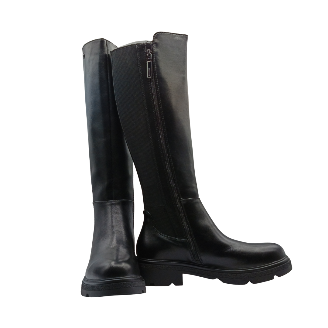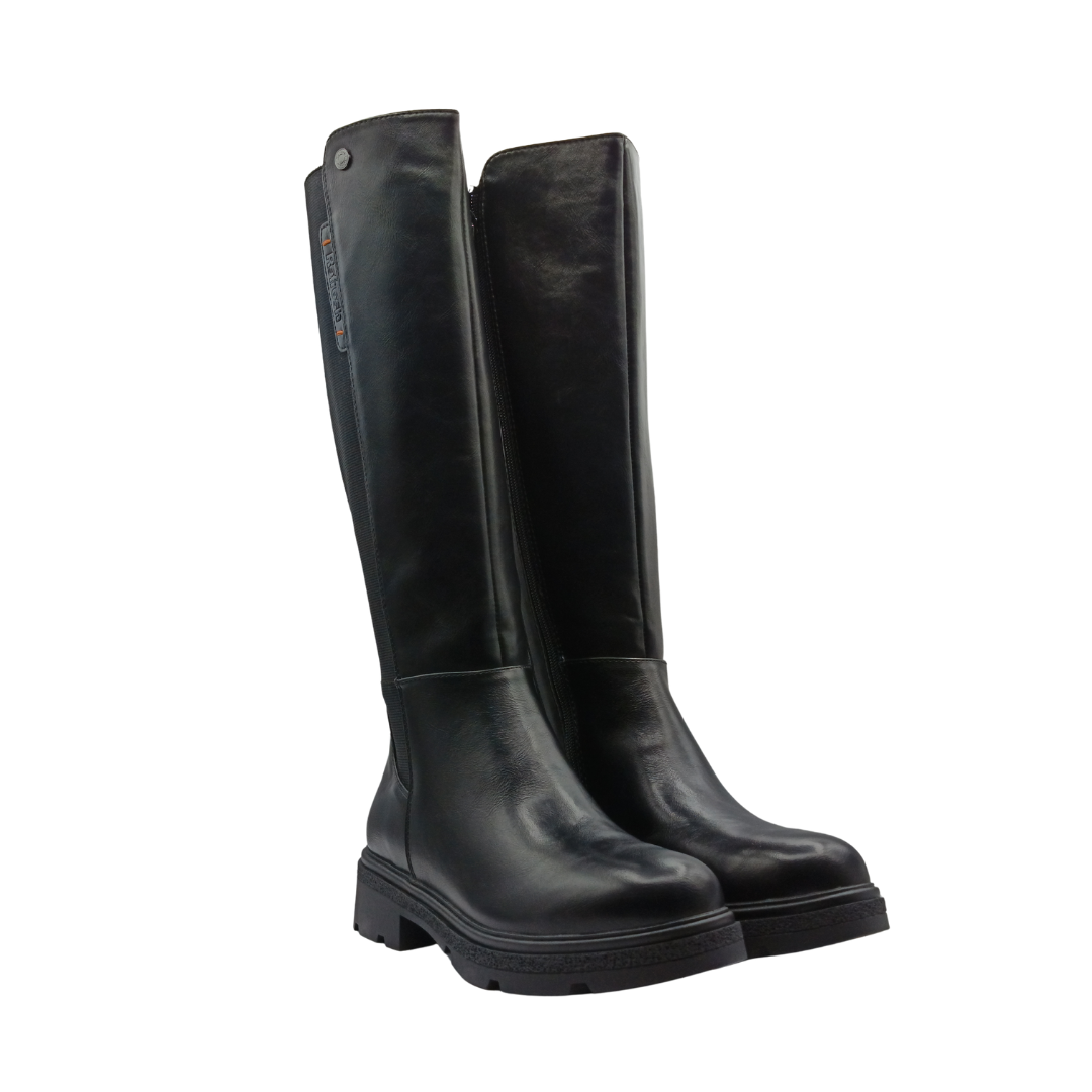 Bota alta Refresh para mujer, perfecta para un look urbano y moderno este invierno. Confeccionada en piel sintética y textil elástico que se adapta a la pierna, incorpora suela de goma antideslizante y tacón ancho de 5 cm para una pisada cómoda y estable. Su plantilla acolchada y cierre elástico garantizan confort y ajuste, mientras el logo metálico añade un toque distintivo.