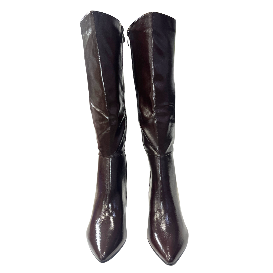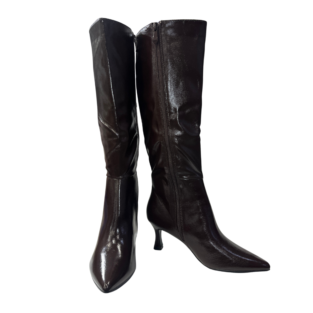 Bota de mujer en color moka con acabado brillante tipo piel, tacón fino, punta afilada, cremallera lateral interior y diseño elegante que estiliza la pierna y combina perfectamente con looks formales o casuales.