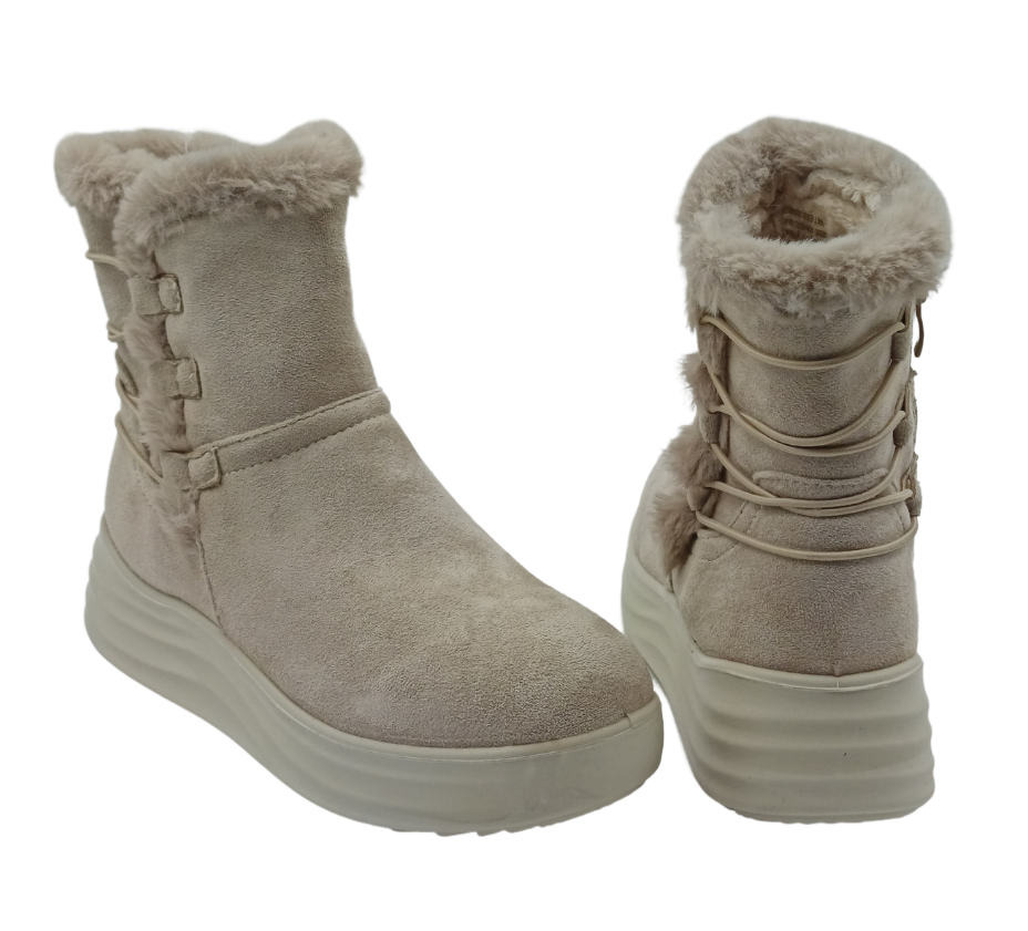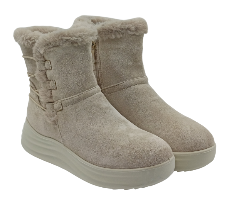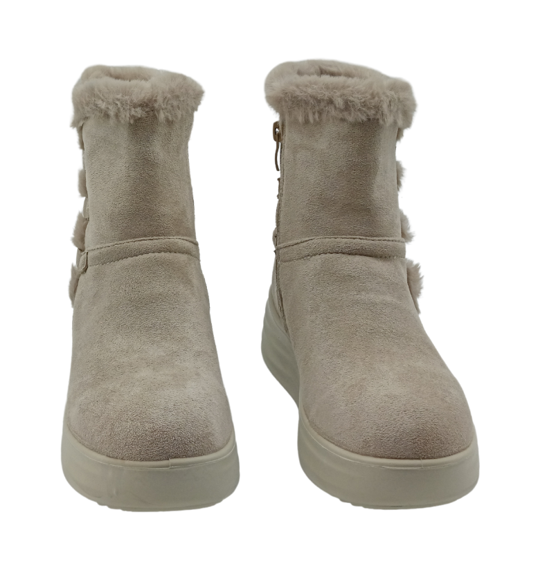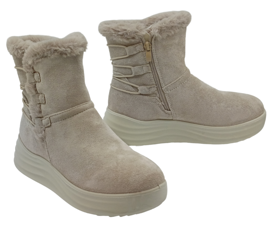 Bota cómoda de mujer, con cierre de cremallera. Fabricado en material sintético, con doble suela de goma ligera y flexible. Plantilla acolchada. Forro interior de pelo sintético. Color beige. Botines abrigados, para que este invierno no pases frío.