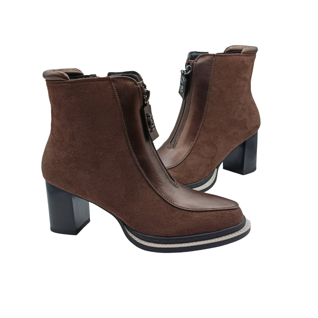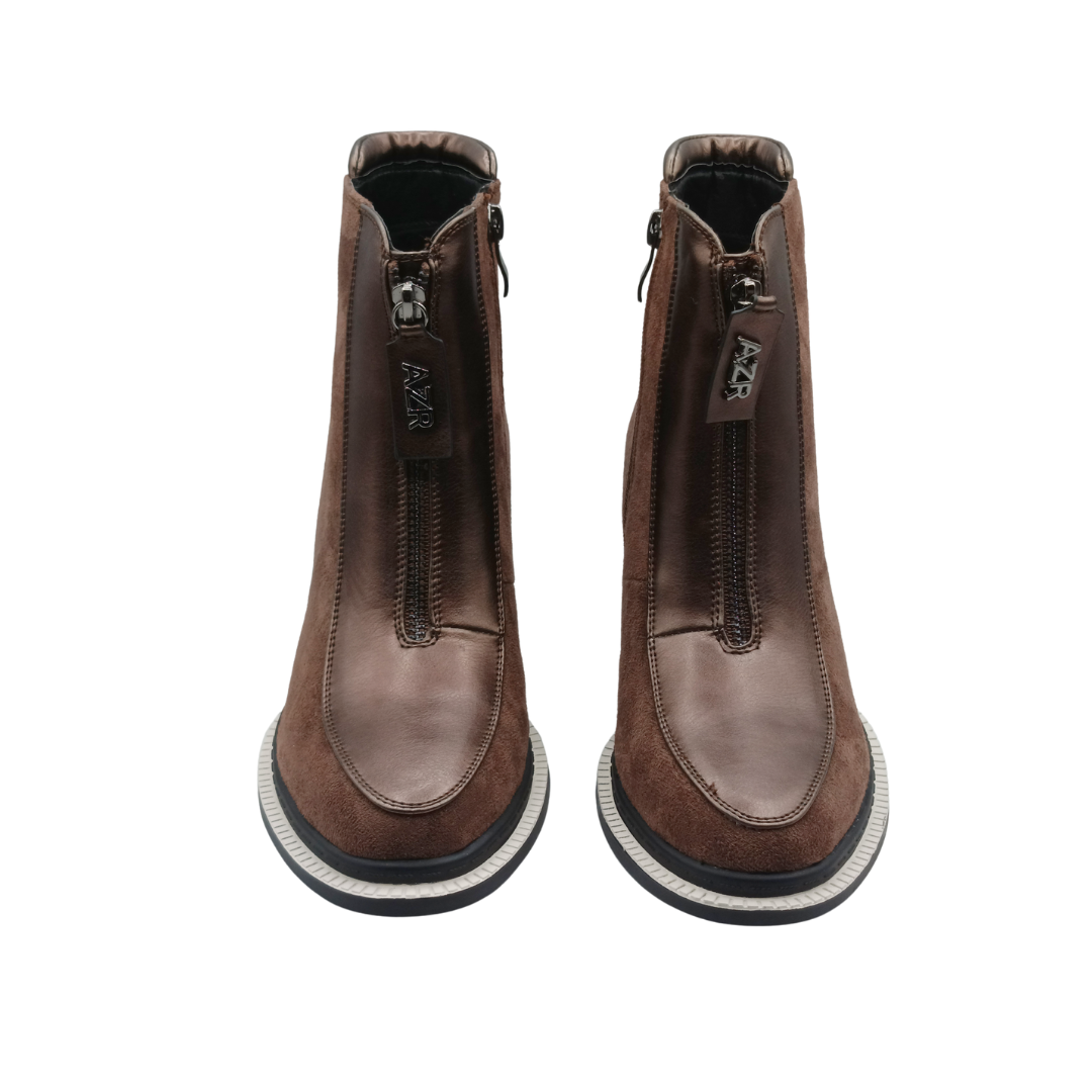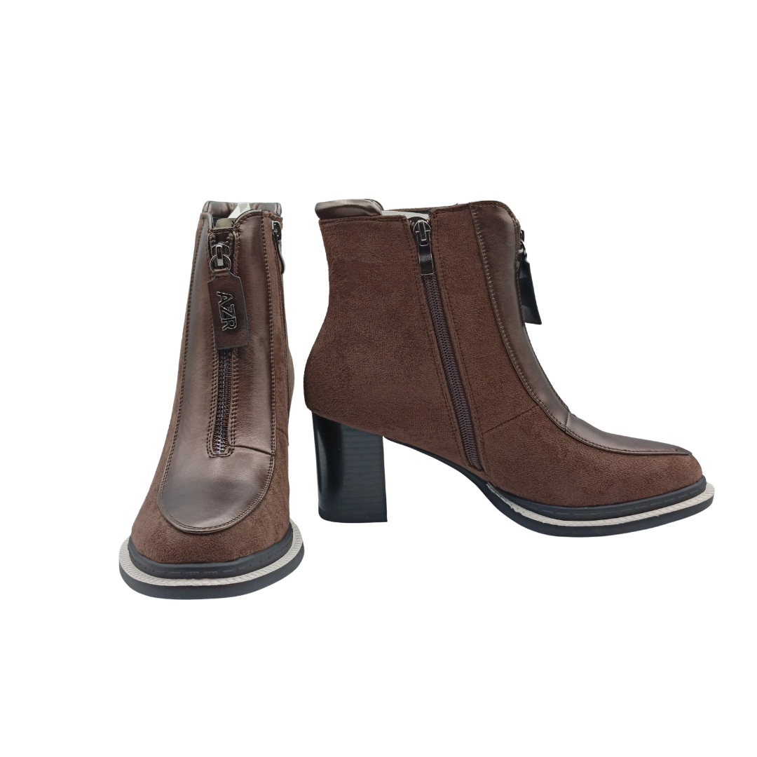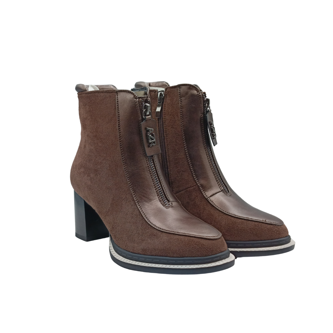 Botín de mujer Azarey con tacón alto y diseño elegante en acabado efecto ante combinado con detalles en piel. Incorpora doble cremallera frontal con tiradores metálicos decorativos que aportan un toque moderno y sofisticado. Su suela con ligera plataforma y tacón cuadrado garantiza estabilidad y confort, ideal para completar looks de diario o de noche con estilo.