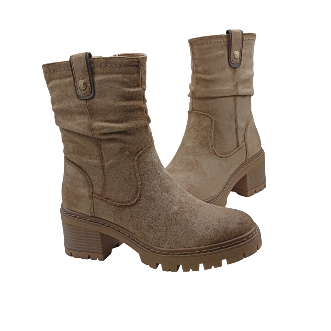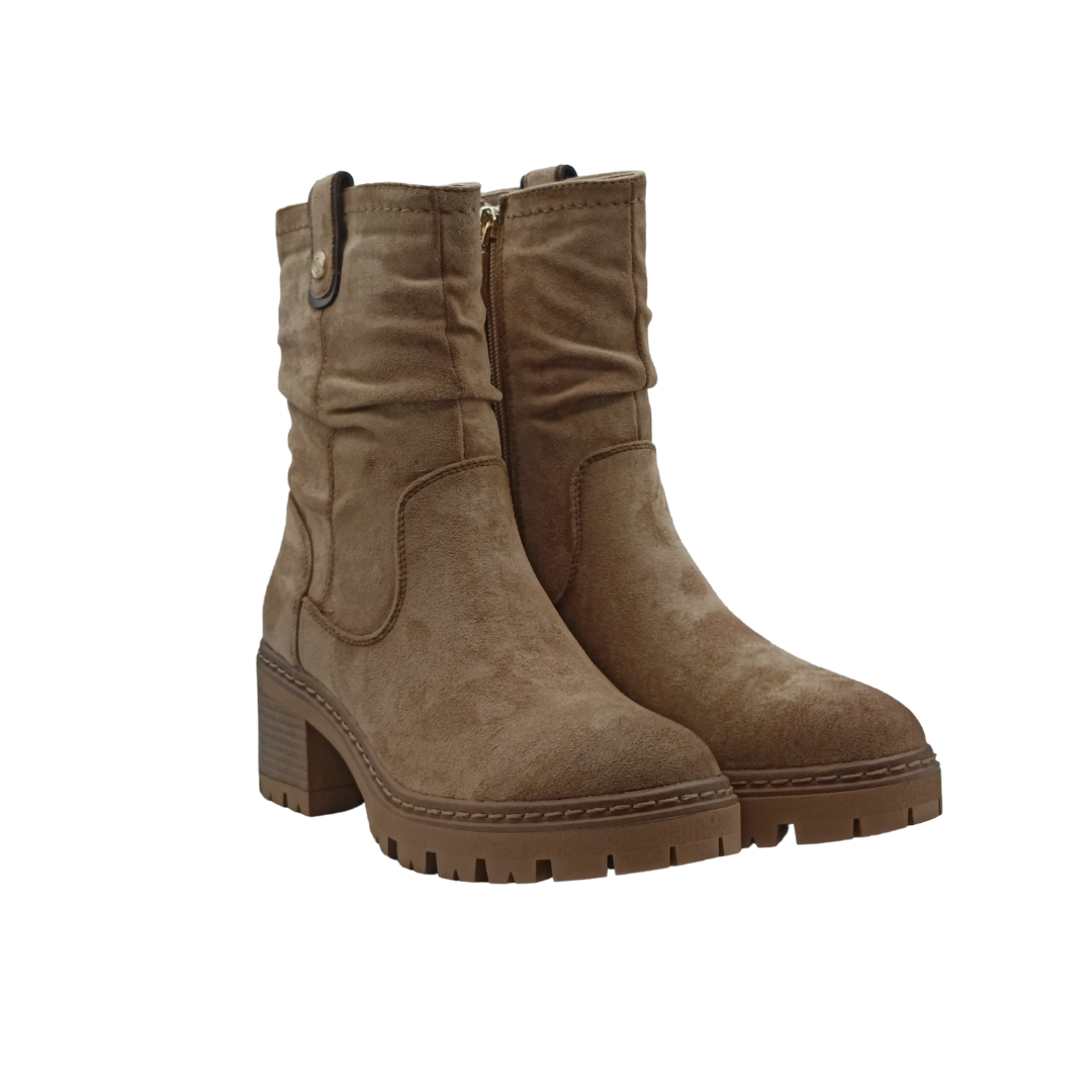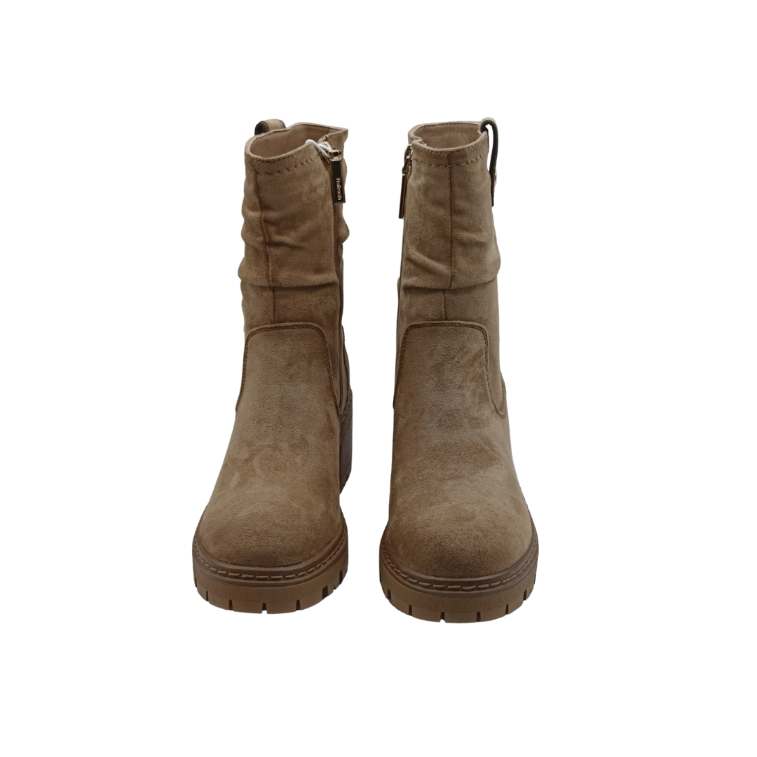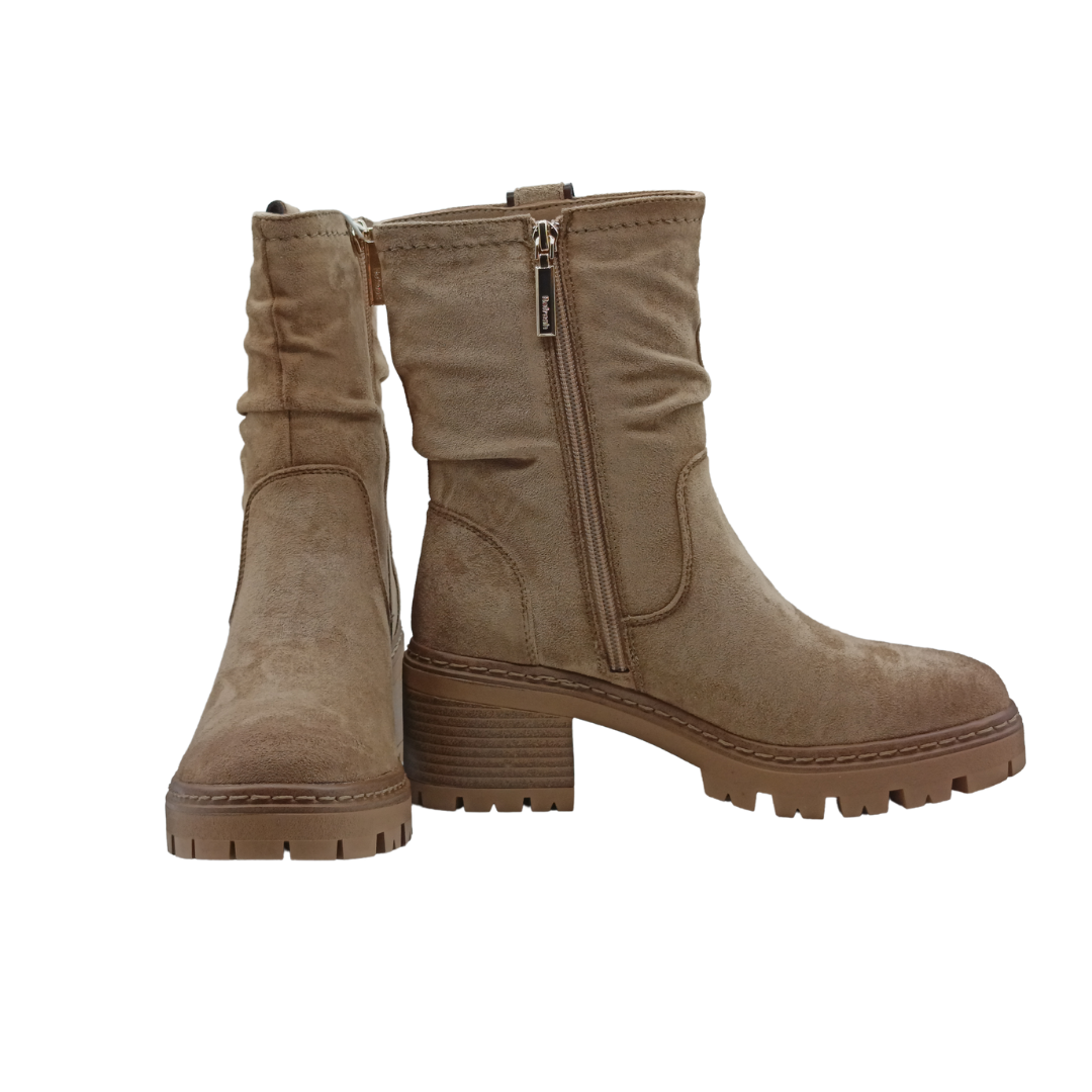 Botín de mujer, de la marca Refresh. Fabricado en una suave antelina. Cierre mediante cremallera interior. Tirador lateral para facilitar el calce. Suela track antideslizante con tacón y plataforma para mayor comodidad. Con plantilla extraíble. Este modelo ha obtenido el certificado vegano por la organización mundial PETA (Organización de los derechos de los animales).