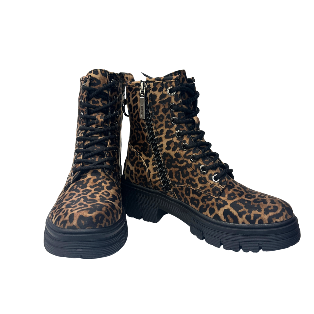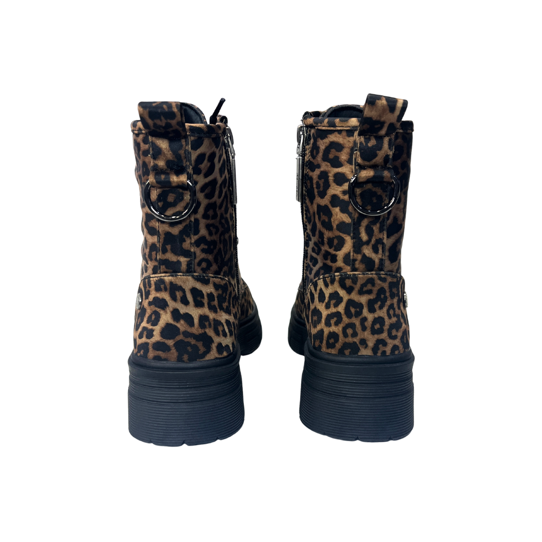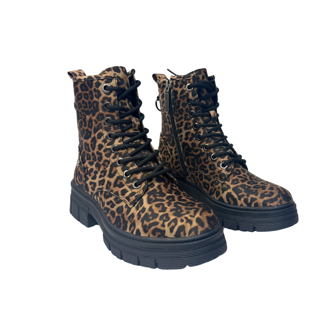 Botines de plataforma para mujer de la marca Refresh, confeccionados en suave tejido con estampado de leopardo que aporta un toque atrevido y moderno. Cuentan con cierre mediante cremallera lateral, cordones regulables y tirador trasero para una colocación sencilla. Suela de goma con volumen de 5 cm y plantilla extraíble. Modelo 100% vegano certificado.
