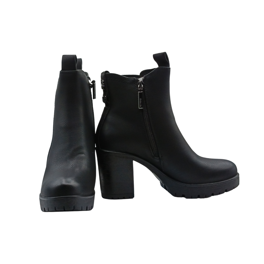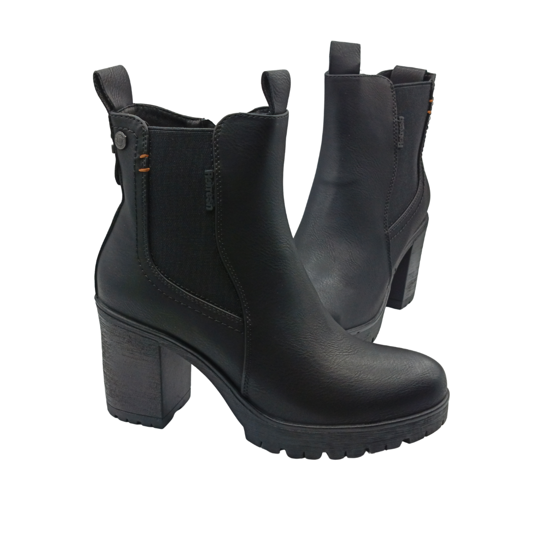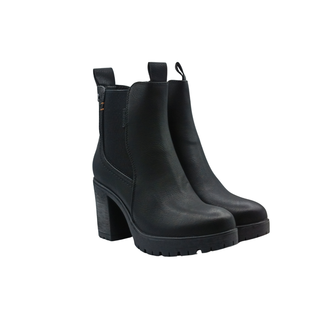Botín de mujer, de la marca Refresh. Fabricado en un material que imita la piel. Cierre mediante cremallera interior. Modelo tipo Chelsea con elástico lateral y tirador trasero para facilitar la puesta. Tacón ancho de 9 cm con suela de goma antideslizante. Tirador trasero para facilitar la puesta. Con plantilla extraíble. Este modelo ha obtenido el certificado vegano por la organización mundial PETA (Organización de los derechos de los animales).