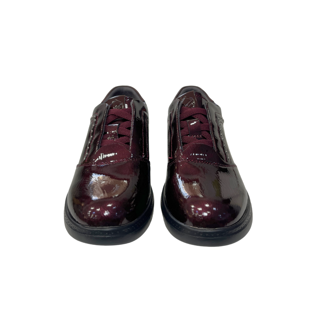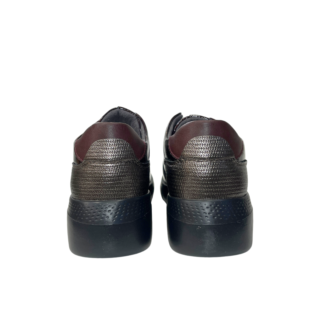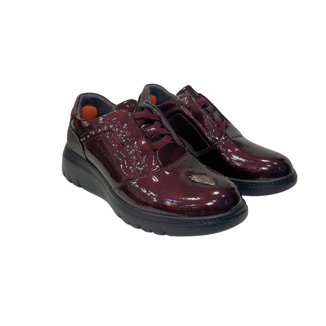 El acabado en charol burdeos destaca con un brillo elegante mientras que su base negra aporta estabilidad y contraste.Es un calzado perfecto para elevar cualquier look casual manteniendo siempre la comodidad.Ideal para quienes quieren un estilo urbano con un toque chic.Cierre con cordones elasticos para un calze rápido.Altura del talón una cuña de 4cm y medio, delante plataforma 1,5cm.Te aconsejo pidas tu numero habitual