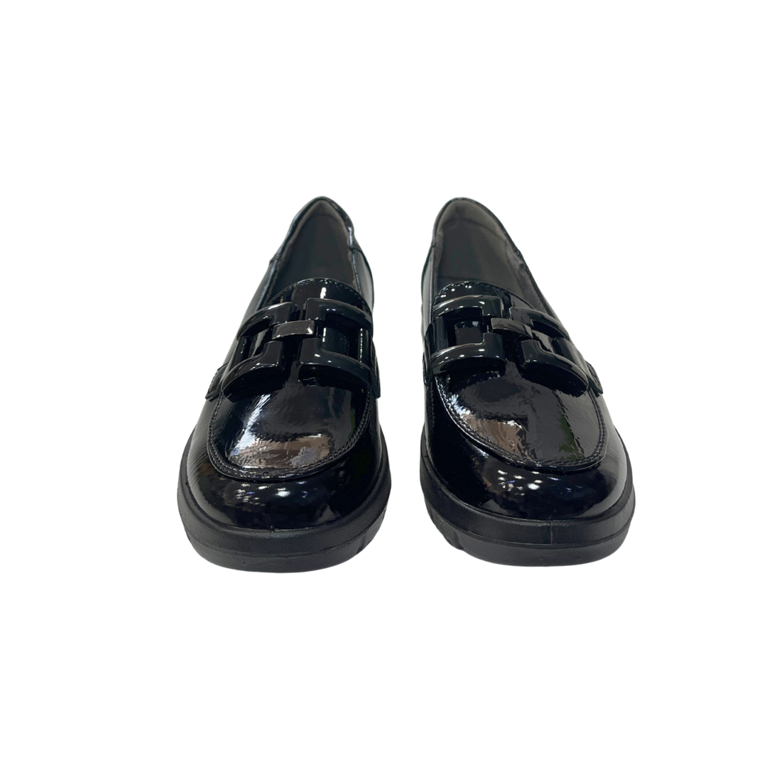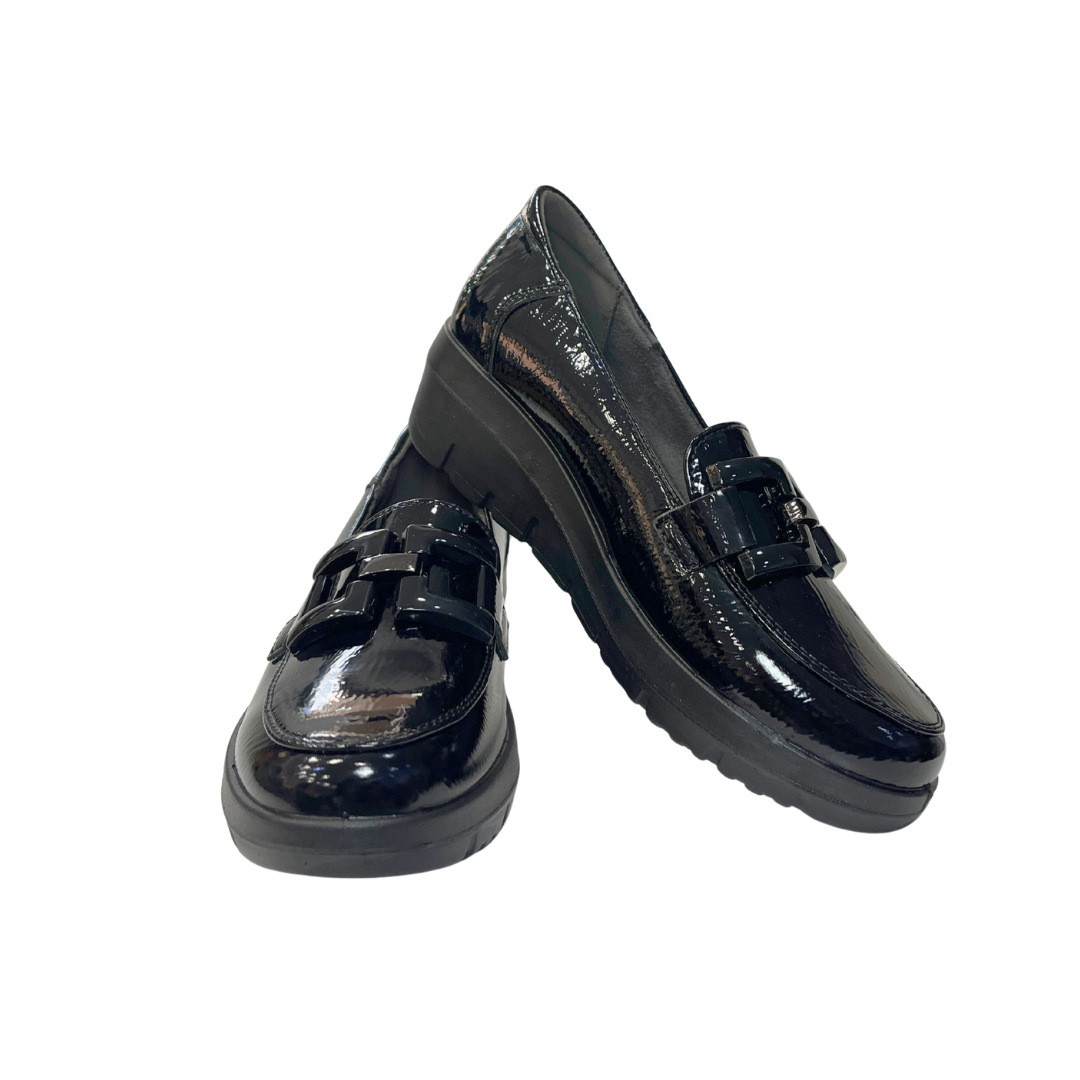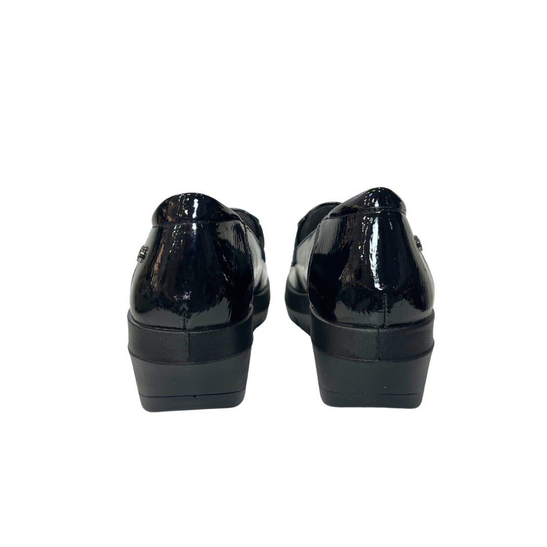 Mocasín para mujer 25M585 de MYSOFT. De PU Leather efecto charol con detalle de cadena en el empeine. Interior en tejido suave y calido con plantilla extarible memory foam, para una pisada más confortable. Suela ligera y flexible con una cuña de unos 6cm de altura.