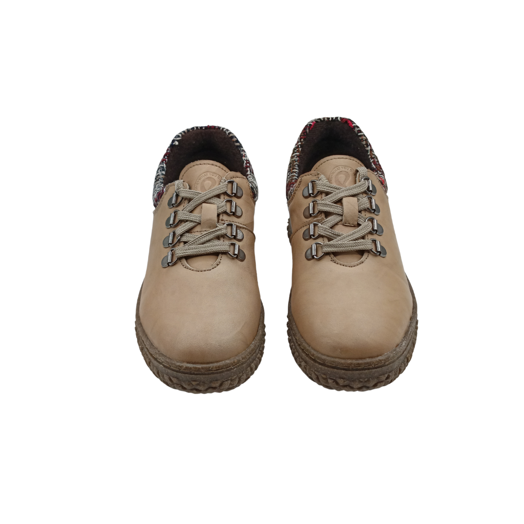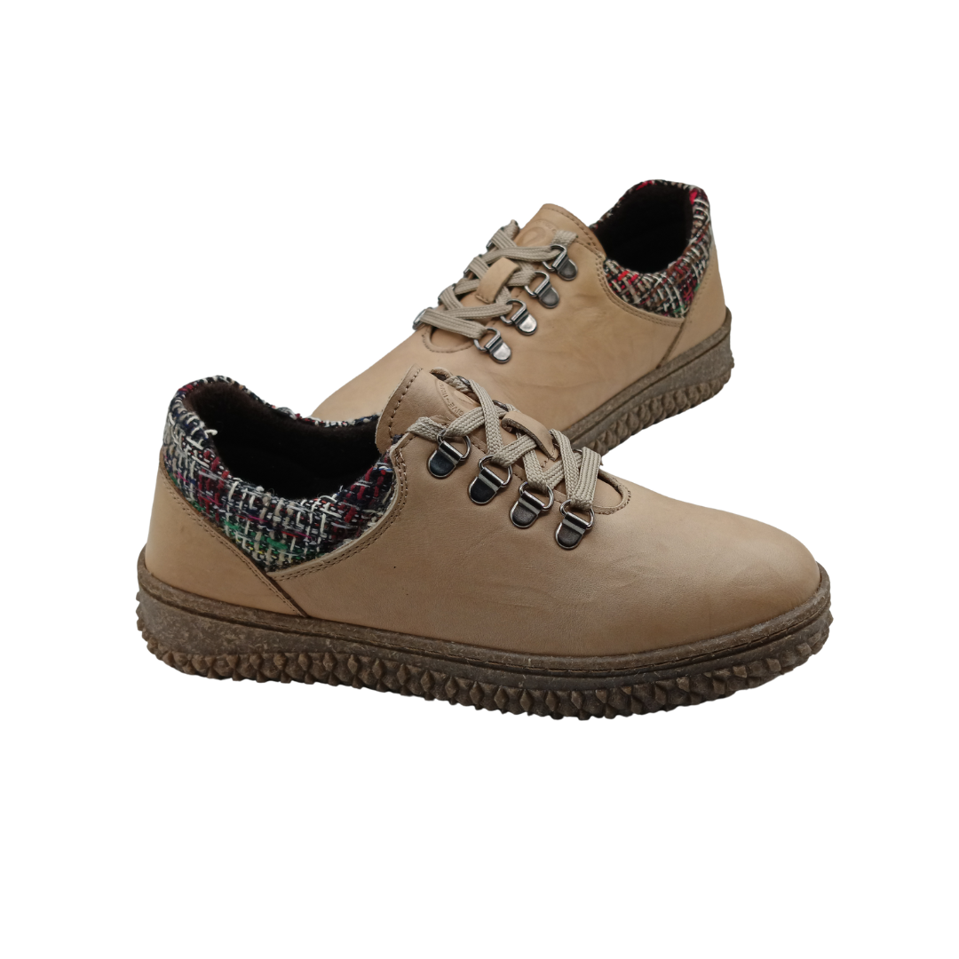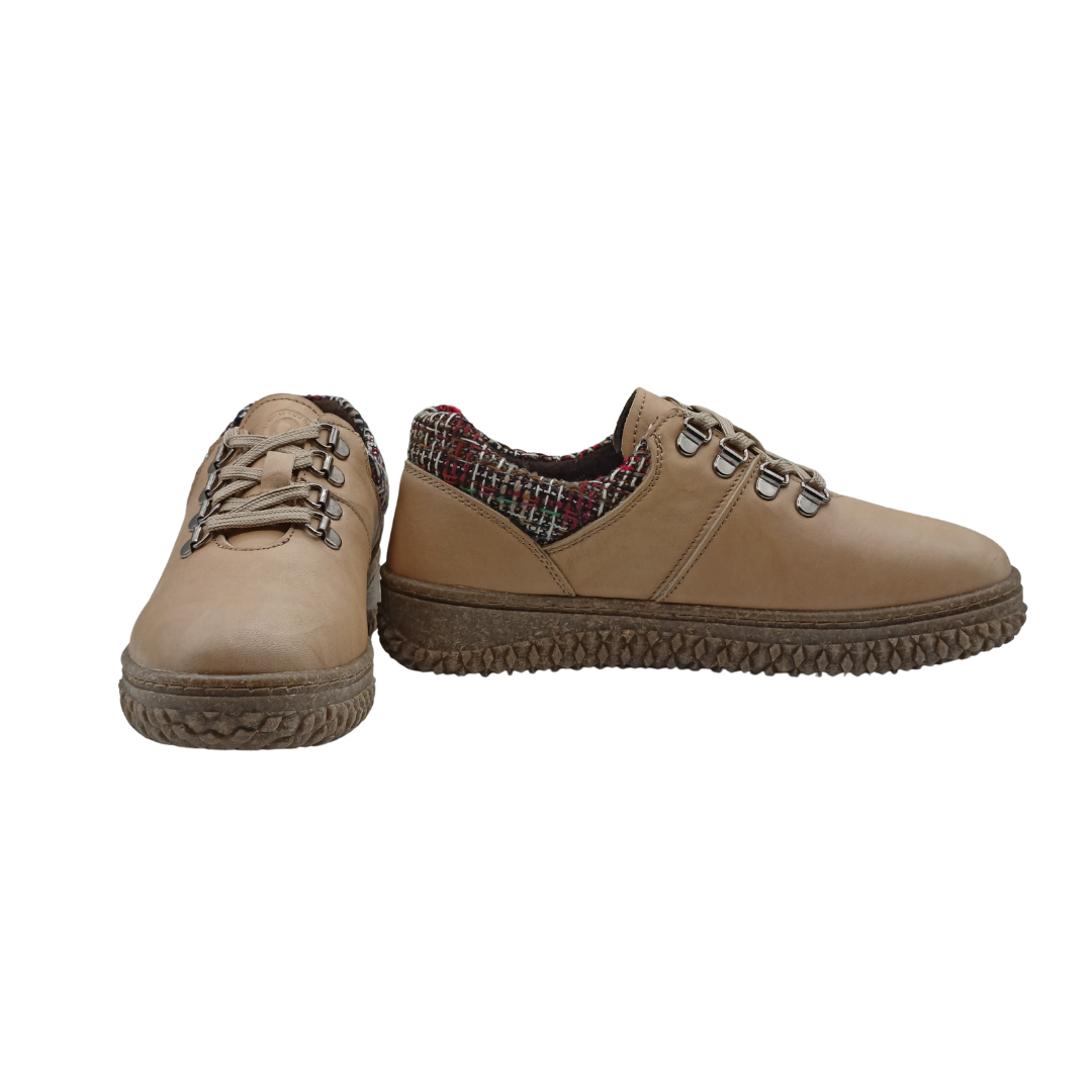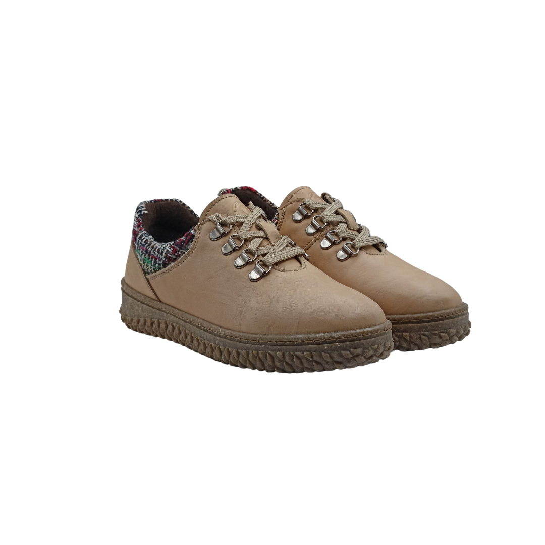Zapato de mujer fabricado en piel natural, con cordones y detalle textil en el talón que aporta un toque distintivo. Incorpora una suela flexible y ligera que garantiza comodidad durante todo el día. Un modelo versátil y moderno, ideal para el uso diario.