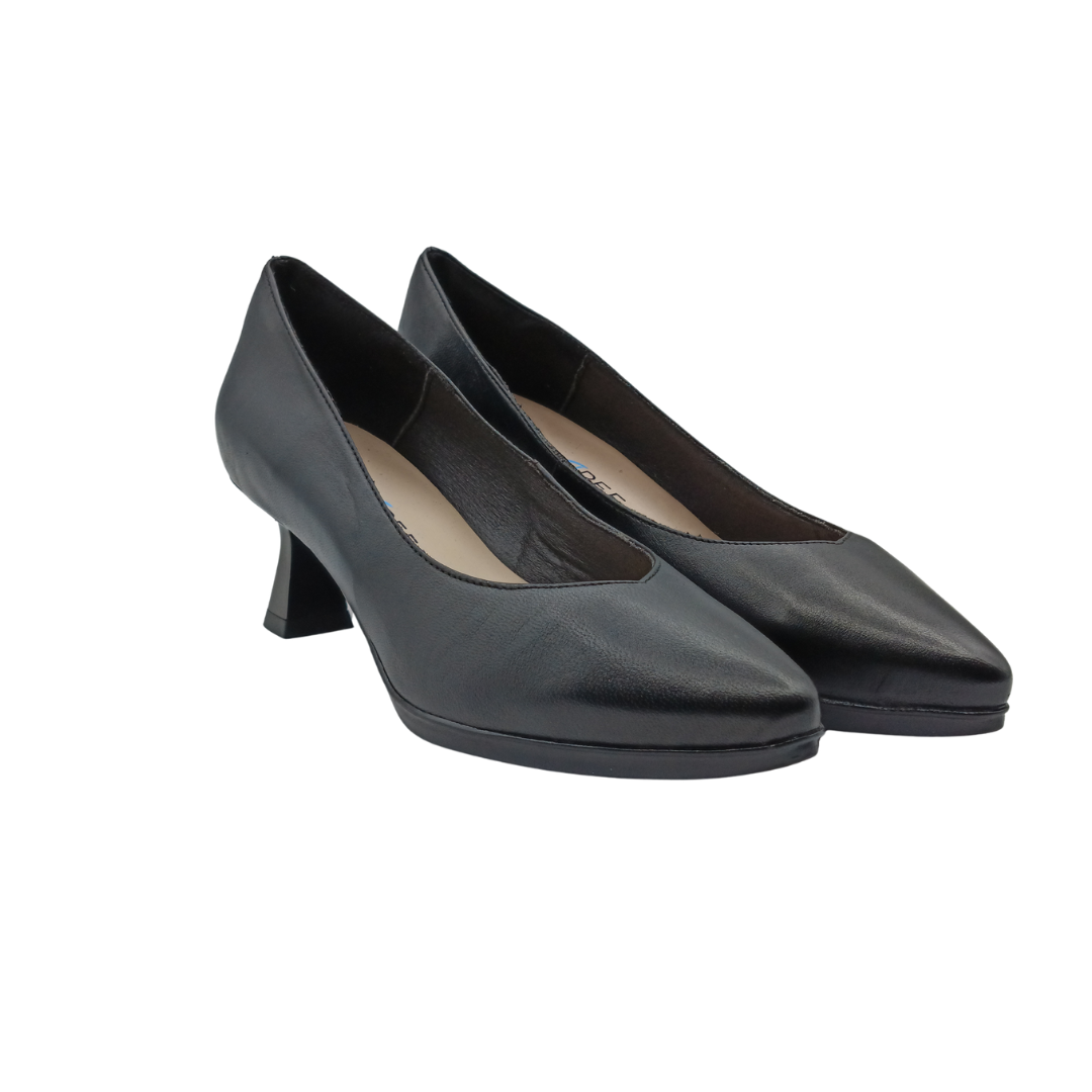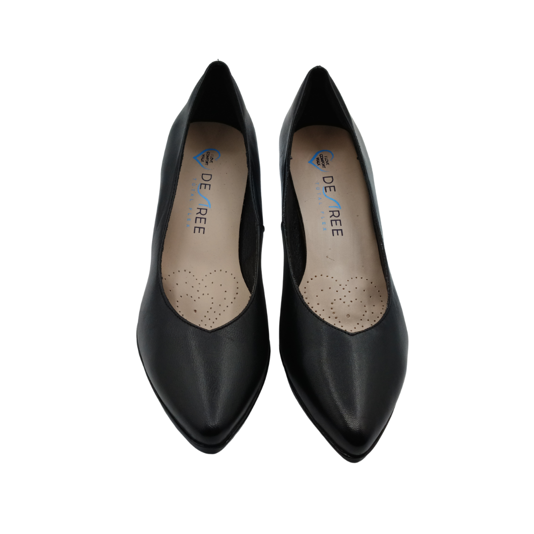 Zapato salon mujer Desiree tacon negro maia10 es un salón de mujer para vestir fabricado en piel suave de color negro y hueco en pico. Tacón medio geométrico de 4,5 cm de altura. Moda y confort unidos , pensado en la mujer de hoy que busca la moda sin renunciar a la comodidad. Un zapato de salón especialmente cómodo y flexible que podrás tener durante largas jornadas sin cansarte. Plantilla acolchada y descanso para el metatarso. Suela de goma flexible y antideslizante. descubre toda la colección de zapato de tacón cómodos. Hecho en España.